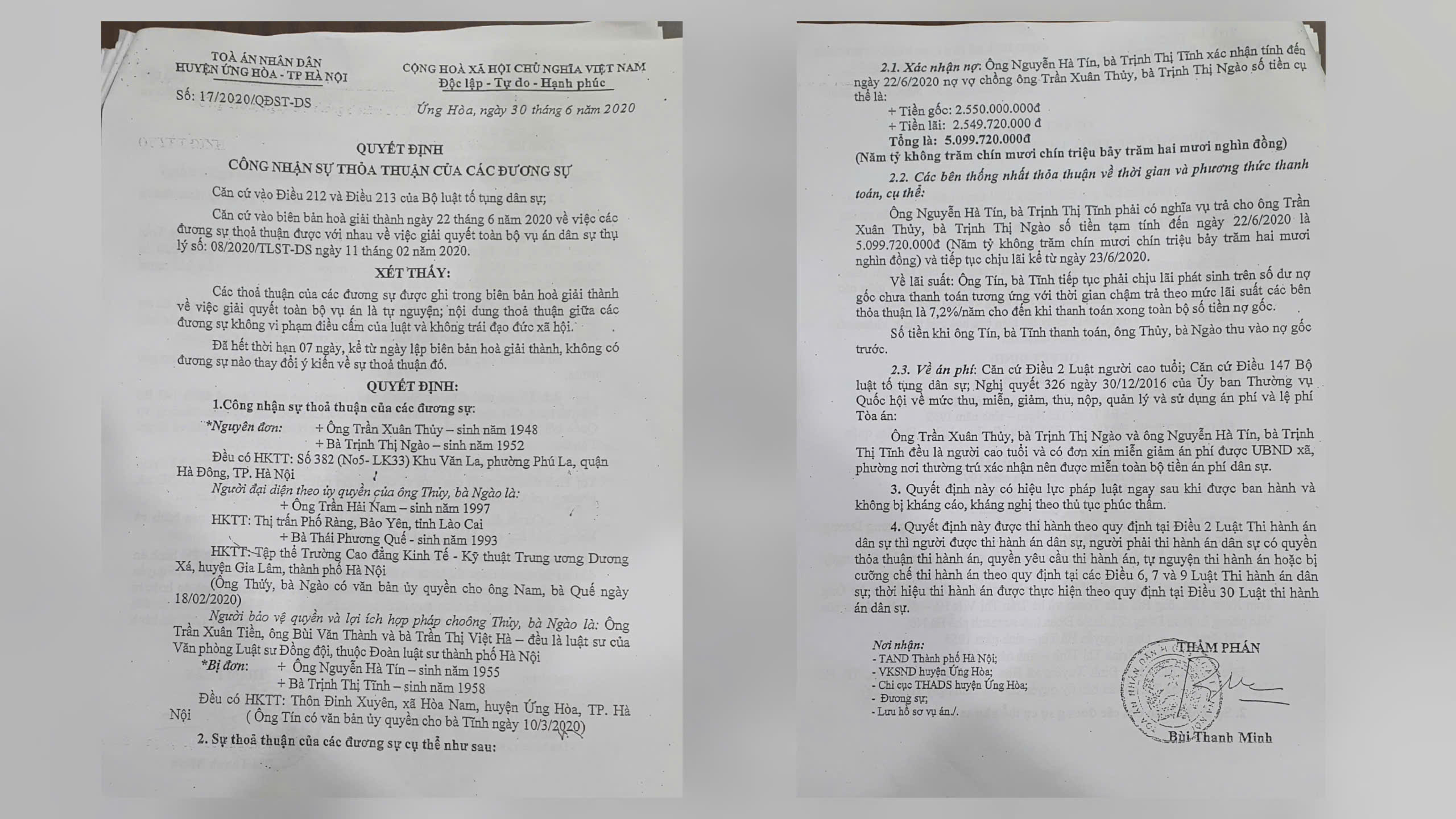 Trước đó, ngày 30/6/2020, tại Quyết định số 17/2020/QĐST-DS về công nhận thỏa thuận dân sự của Tòa án Nhân dân huyện Ứng Hòa, Hà Nội đã xác nhận nợ: Ông Nguyễn Hà Tín, bà Trịnh Thị Tĩnh xác nhận tính đến ngày 22/6/2020 nợ vợ chồng ông Trần Xuân Thủy, bà Trịnh Thị Ngào số tiền: Gốc 2.550.000.000đ; lãi: 2.549.720đ; tổng là 5.099.720.000đ (Năm tỷ không trăm chín mươi triệu bảy trăm hai mươi ngàn đồng).