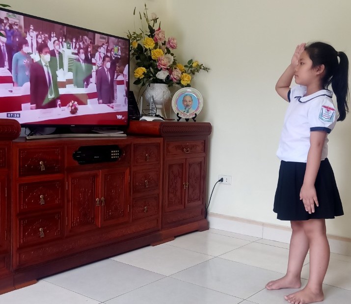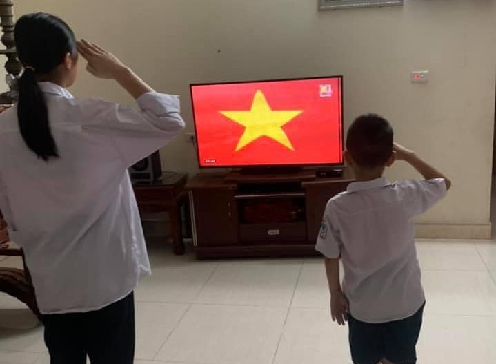 Nguyễn Trang (Học sinh trường Tiểu học Đại Yên) cũng dự khai giảng chung qua màn hình tivi. "Tiếng trống trường khiến em rất nhớ bạn bè và thầy cô", Trang chia sẻ. Chị Chu Lộc, mẹ của học sinh Nguyễn Trang, cho biết lần đầu dự lễ khai giảng đặc biệt này, con háo hức. Sau nhiều ngày ở nhà, nữ sinh rất vui khi được gặp thầy cô, bạn bè dù chỉ qua màn hình.