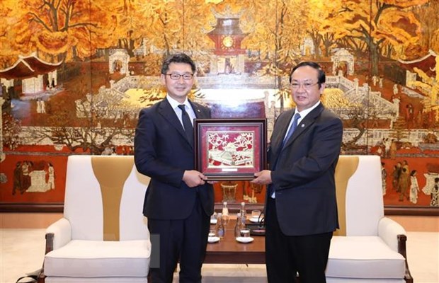 | Phó Chủ tịch UBND Thành phố Hà Nội Nguyễn Thế Hùng tặng quà lưu niệm cho ông Tosho Matsuo. (Ảnh: Văn Điệp/TTXVN) |