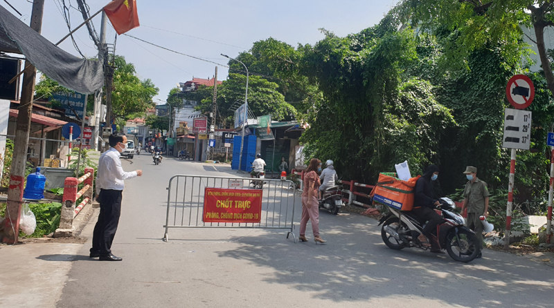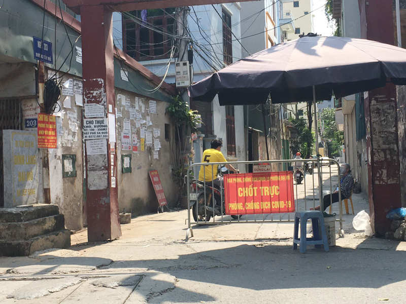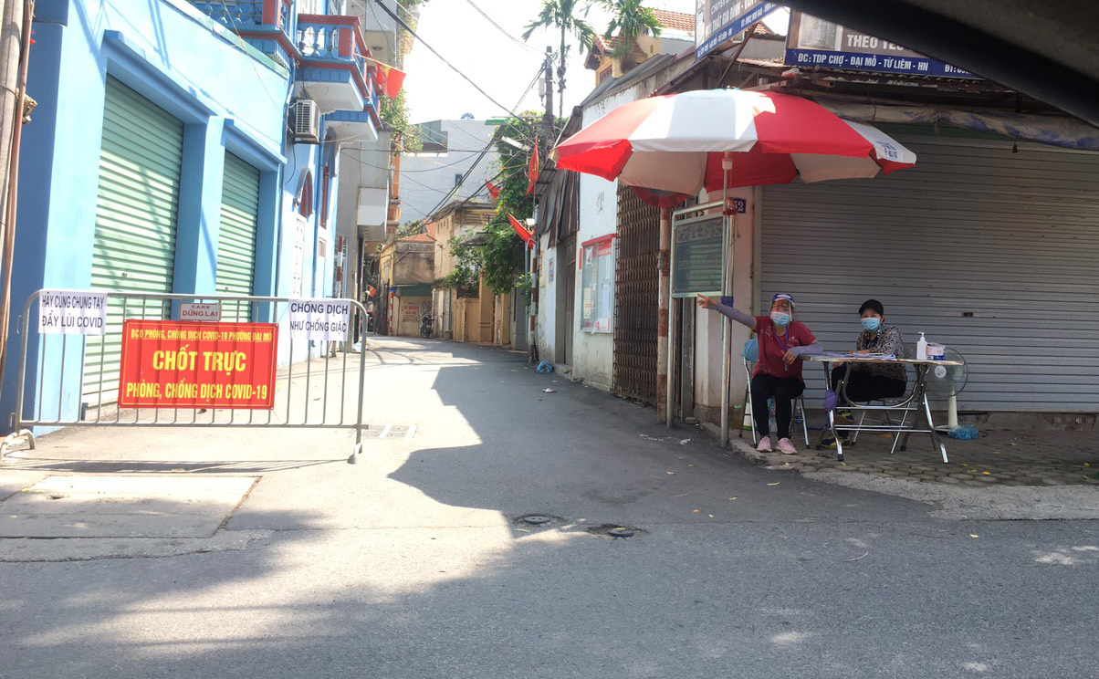 Các chốt ở các ngõ chính trên các trục đường phường Đại Mỗ luôn có người trực và thực hiện việc kiểm . tra người dân chấp hành quy định phòng, chống dịch.