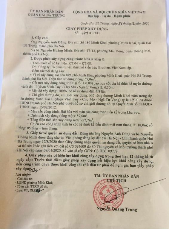 Theo phản ánh, công trình 189 Minh Khai đã được ông Nguyễn Quang Trung (Chủ tịch UBND quận Hai Bà Trưng) cấp Giấy phép xây dựng số 789/GPXD vào ngày 18/12/2020 cho ông Nguyễn Anh Dũng và bà Nguyễn Hoàng Minh.