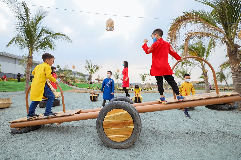 Home Hanoi Xuan 2021 còn có sân chơi tái chế Think Playground sinh động, đầy màu sắc để các em nhỏ được vui đùa, thỏa sức sáng tạo đồng thời củng cố thêm ý thức bảo vệ thiên nhiên, môi trường với các đồ chơi tái chế như nhảy trên lốp xe, cầu trượt ván gỗ, cầu bập bênh…
