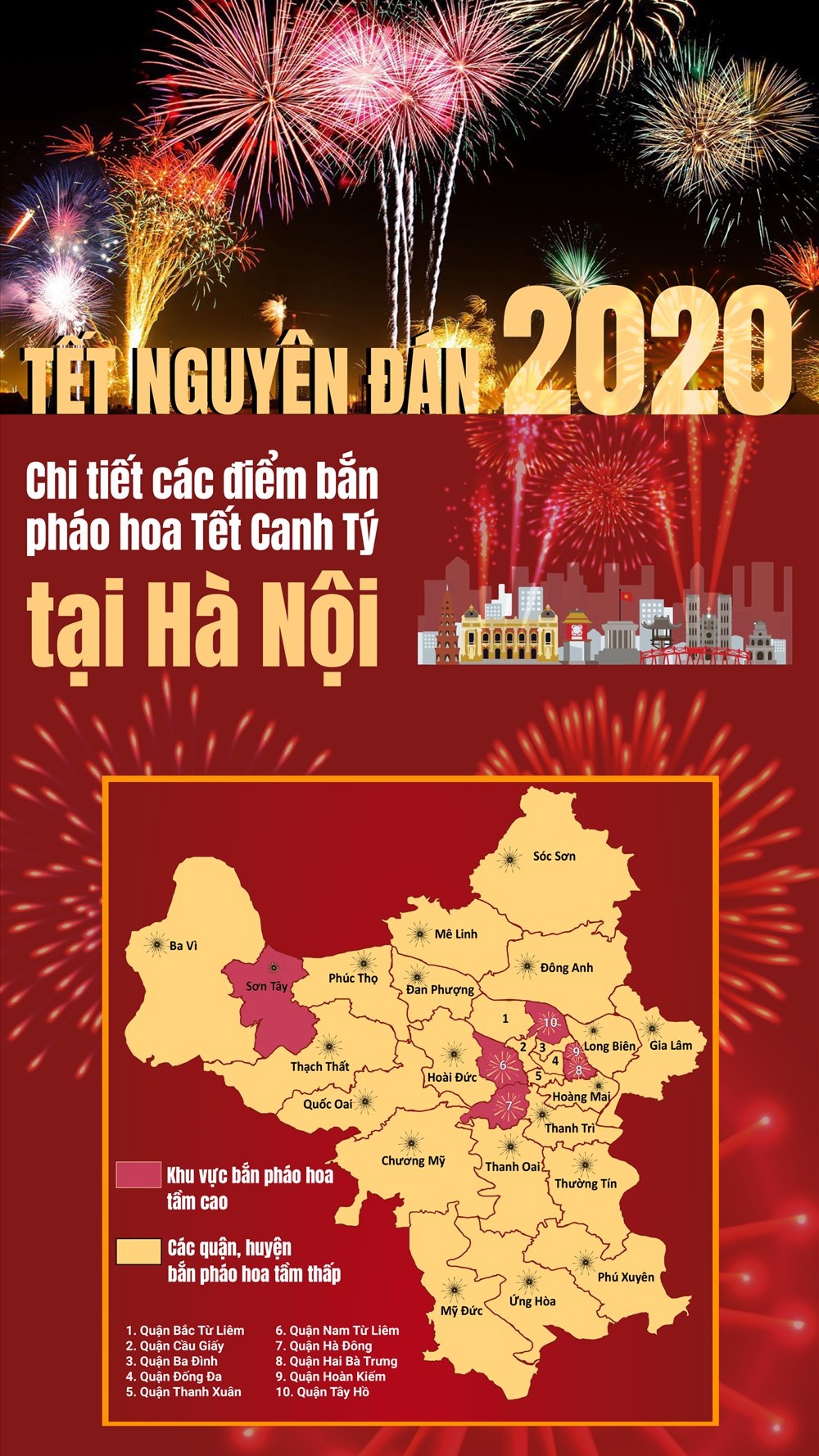 Được biết, đêm giao thừa Tết Canh Tý, Ủy ban nhân dân TP.Hà Nội sẽ tổ chức bắn pháo hoa Tết Nguyên đán Canh Tý tại 30 điểm (bao gồm 6 trận địa bắn tầm cao và 24 trận địa bắn tầm thấp).