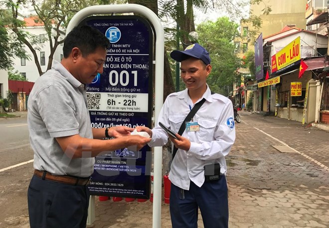 | Khách hàng nhận hóa đơn từ nhân viên trông giữ phương tiện tại điểm đỗ sử dụng công nghệ iParking trên phố Lý Thường Kiệt. (Ảnh: Việt Hùng/Vietnam+) |