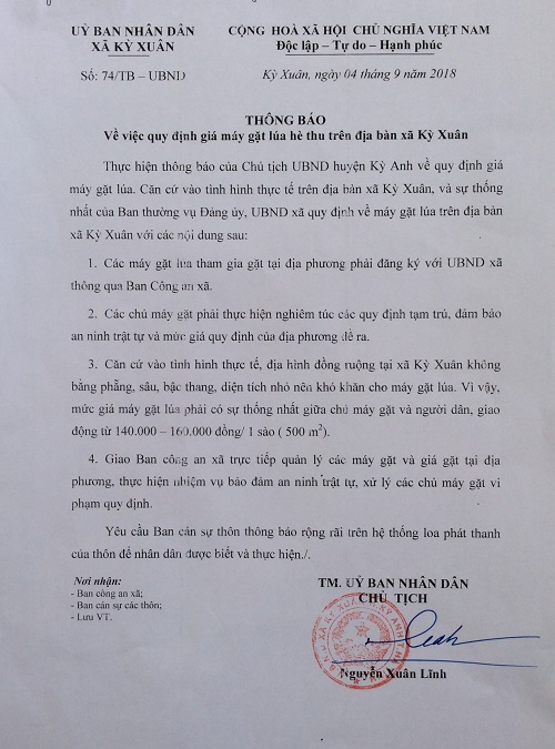 Ông Nguyễn Xuân Lĩnh - Chủ tịch UBND xã Kỳ Xuân cho biết, sau khi UBND xã có thông báo về quy định giá máy gặt lúa vụ hè thu năm 2018, tiến hành giao cho Ban Công an xã trực tiếp quản lý các máy gặt và giá gặt tại địa phương, đảm bảo an ninh trật tự, xử lý các chủ máy gặt vi phạm. Đồng thời yêu cầu Ban cán sự xóm thông báo đến người dân nắm để thực hiện.