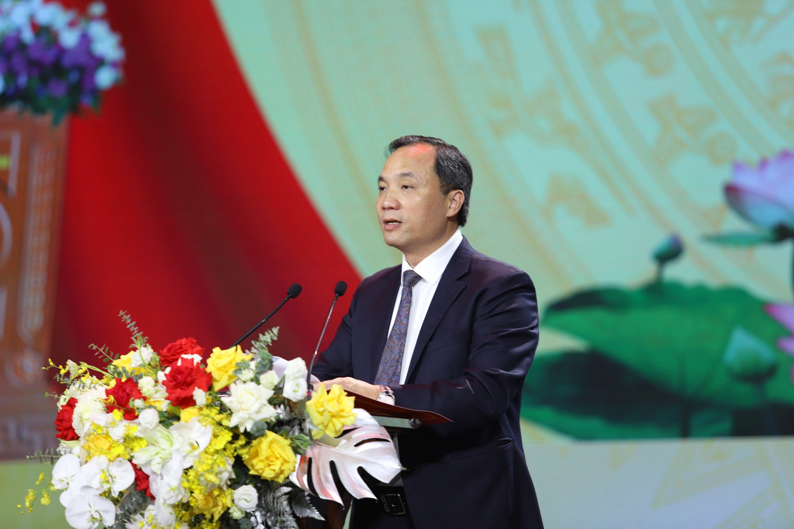 Bí thư Tỉnh ủy Hoàng Trung Dũng trình bày diễn văn tại lễ kỷ niệm.