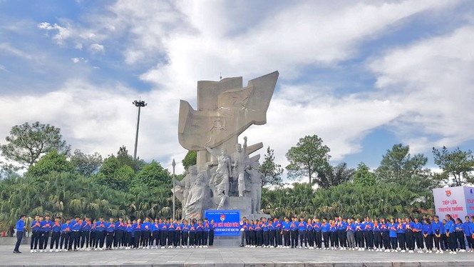90 đoàn viên mới được kết nạp và trao thẻ đoàn viên trước Tượng đài Xô Viết Nghệ Tĩnh.
