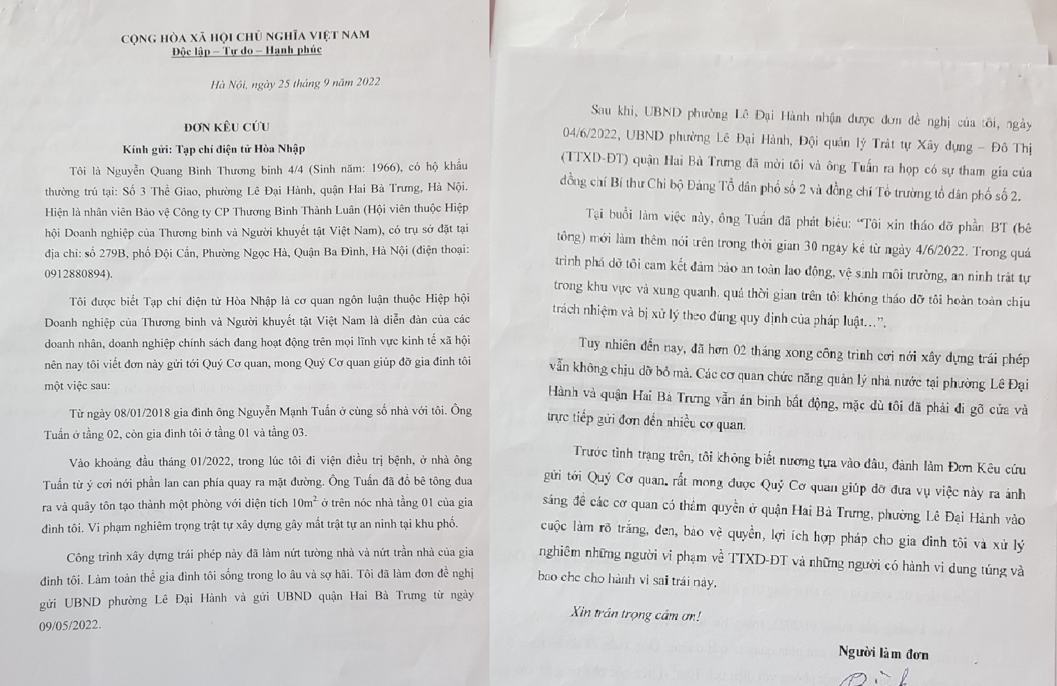 Tuy nhiên đến nay, đã hơn 02 tháng xong công trình cơi nới xây dựng trái phép vẫn không chịu dỡ bỏ mà. Các cơ quan chức năng quản lý nhà nước tại phường Lê Đại Hành và quận Hai Bà Trưng vẫn án bình bắt động, mặc dù tôi đã phải đi gõ cửa và trực tiếp gửi đơn đến nhiều cơ quan.