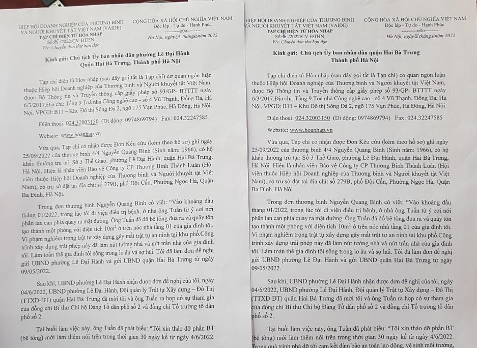 Sau khi nghiên cứu đơn, hồ sơ, ngày 02/10/2022, Tạp chí điện tử Hòa nhập đã có Công văn số 75 và 76/2022/CV-ĐTHN chuyển đơn (Kèm theo hồ sơ) của ông Nguyễn Quang Bình (địa chỉ số 3 Thể Giao) đến các cơ quan UBND phường Lê Đại Hành và UBND Quận Hai Bà Trưng để xem xét, giải quyết theo thẩm quyền và thông báo kết quả, giúp chúng tôi trả lời bạn đọc.