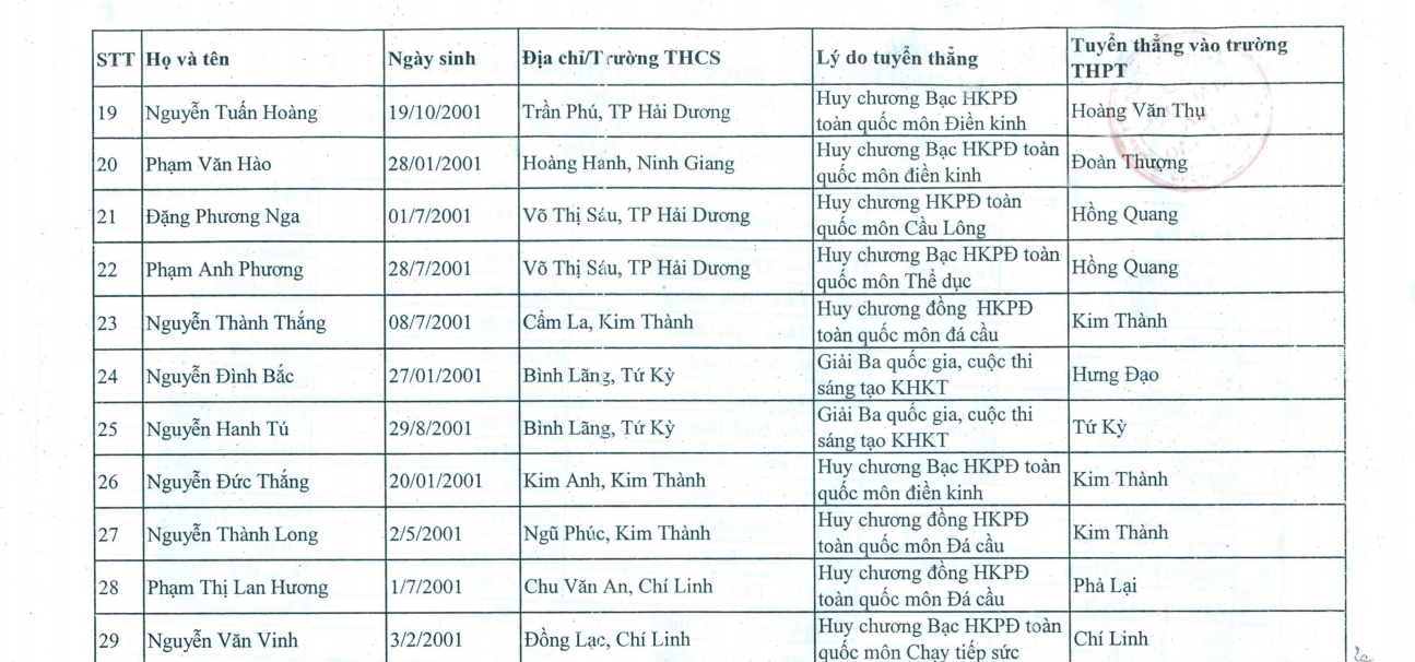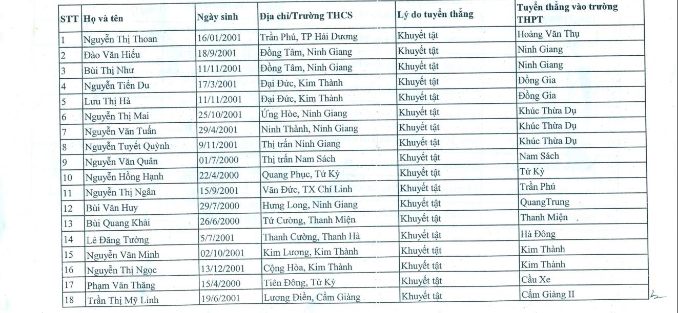 Danh sách cụ thể 29 thí sinh được tuyển thẳng vào 10 của Hải Dương như sau: