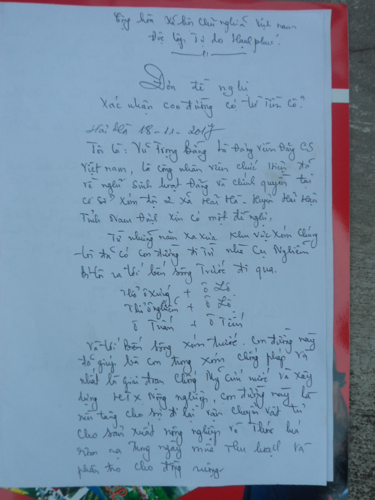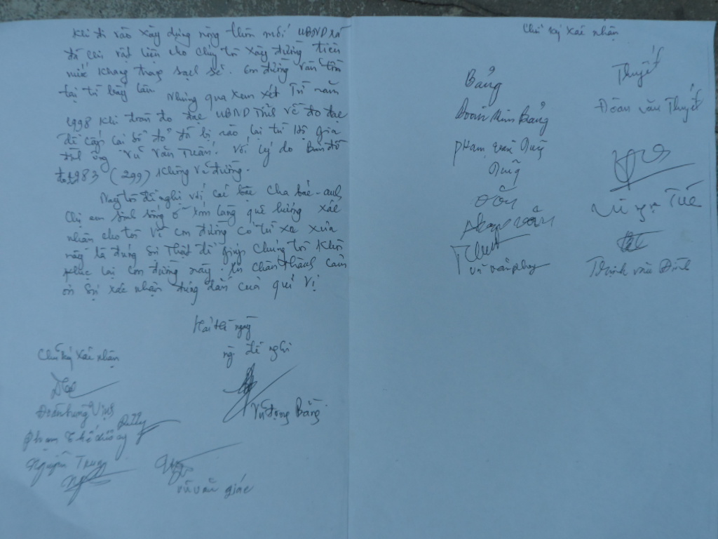 | Đơn đề nghị xác nhận con đường có từ thời tiền cổ, có chữ ký của nhiều người dân, trong đó có một số đảng viên tại xóm 2 xã Hải Hà |