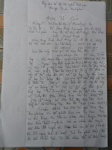| Đơn tố cáo của ông Vũ Trọng Bằng ở xóm 2, xã Hải Hà, huyện Hải Hậu (Nam Định) gửi Tòa soạn Tạp chí Điện tử Hòa Nhập. |