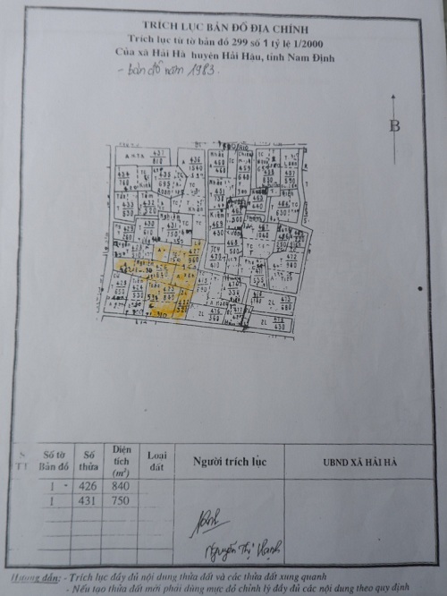 | Bản đồ địa chính năm 1983 trích lục từ tờ bản đồ 299 của xã Hải Hà bị sửa chữa, tẩy xóa. |