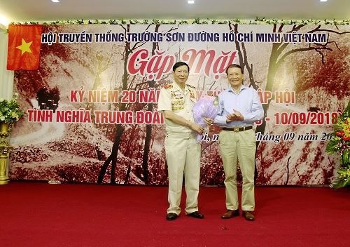 | Thiếu tướng Hoàng Anh Tuấn, Phó Chủ tịch Thường trực Trung ương Hội truyền thống Trường Sơn đường Hồ Chí Minh Việt Nam tặng hoa. |