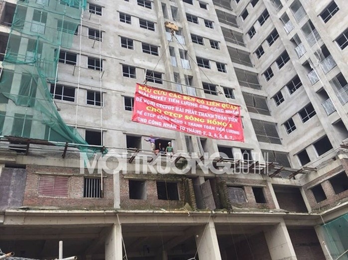 Trong đó, công nhân viết “Kêu cứu các bên liên quan giải quyết tiền lương, đề nghị Công ty Cổ phần Đầu tư Hải Phát thanh toán tiền cho Công ty Cổ phần Sông Hồng 1 để Công ty Cổ phần Sông Hồng 1 thanh toán tiền lương cho công nhân từ tháng 2, 3, 4, 5, 6, 7”.