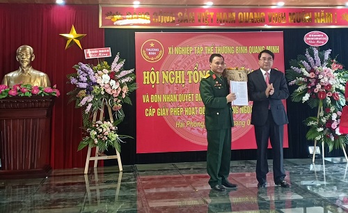 | Ông Lê Khắc Nam - Phó Chủ tịch UBND TP Hải Phòng trao quyết định cấp giấy phép hoạt động bảo tàng cho Xí nghiệp Tập thể thương binh Quang Minh |