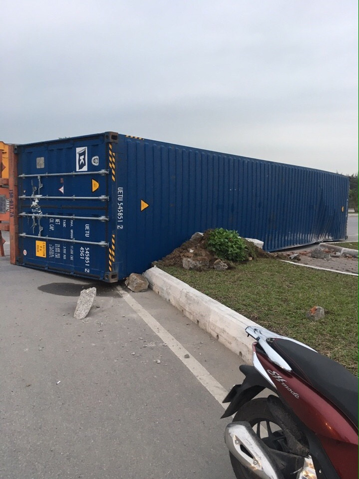 Theo đó, container thiệt hại nặng, dải phân cách bị hư hỏng, gẫy đổ 1 số cây xanh, làm ùn tắc giao thông. Mặc dù không có thiệt hại về người nhưng đây cũng là lời cảnh tỉnh cho các lái xe về việc làm chủ tốc độ khi tham gia giao thông.