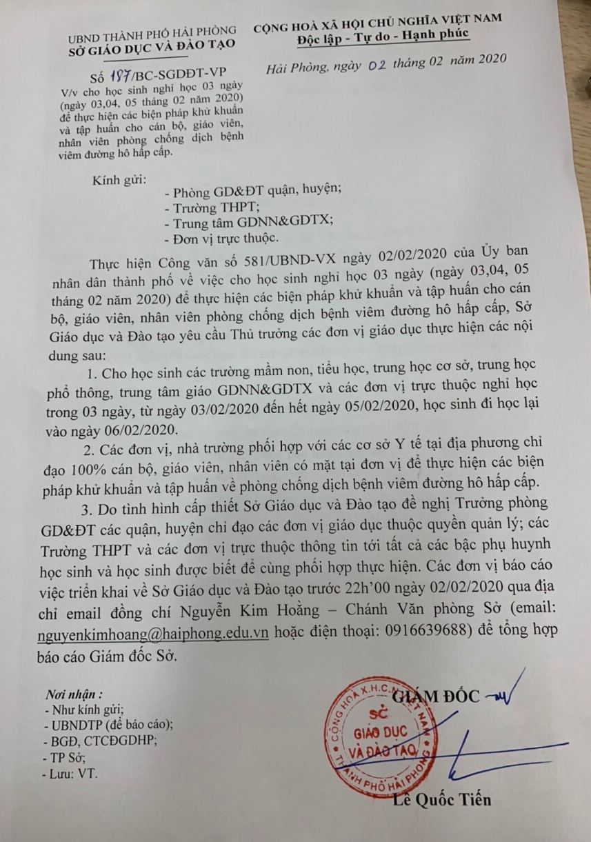 Do tình hình cấp thiết, sở GD&ĐT chỉ đạo các phòng GD&ĐT quận, huyện chỉ đạo các đơn vị giáo dục thuộc quyền quản lý; học sinh được biết để cùng phối hợp thực hiện; Các đơn vị báo cáo về sở GD&ĐT trước 22h ngày 02/02.