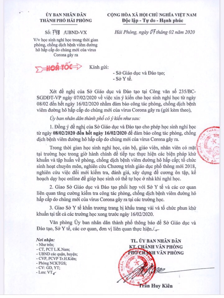 Văn bản của TP Hải Phòng cho học sinh nghỉ học thêm một tuần nữa