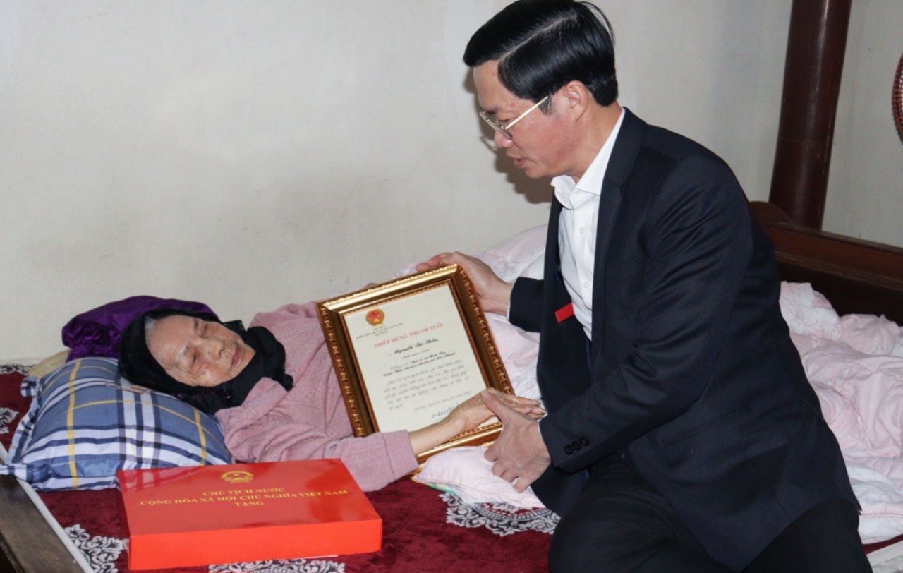 Chủ tịch HDND TP trao Thiếp mừng thọ của Chủ tịch nước cho Mẹ VNAH Nguyễn Thị Thỏa