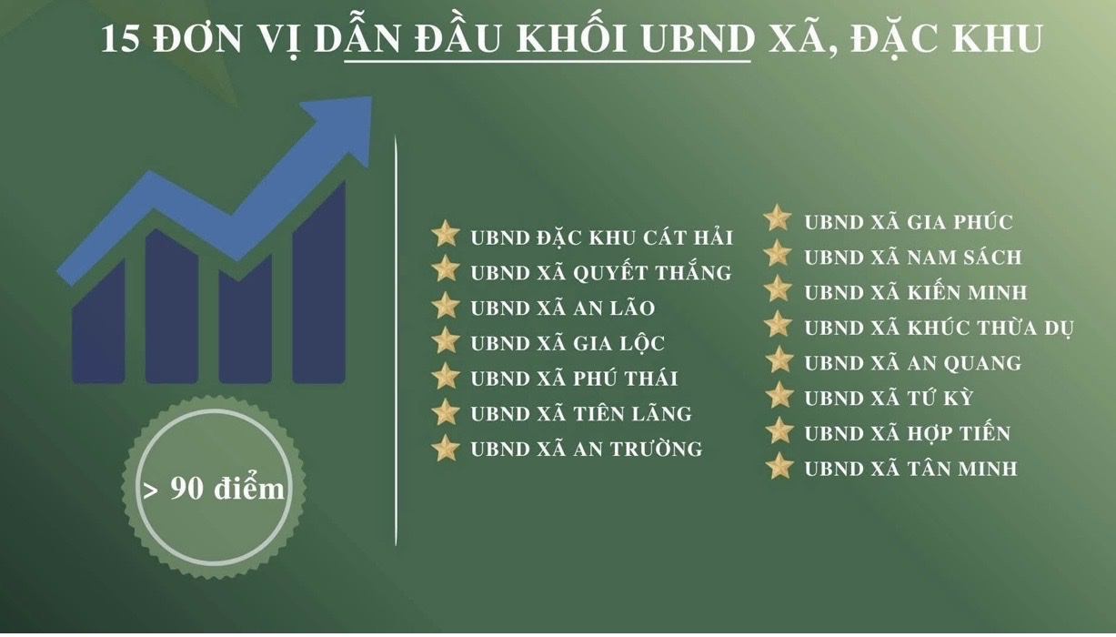 Đối với khối xã, đặc khu, đặc khu Cát Hải xếp thứ nhất với 94,15 điểm; xã Quyết Thắng xếp thứ hai với 93,4 điểm; xã An Lão xếp thứ ba với 92,94 điểm; xã Gia Lộc xếp thứ tư với 90,96 điểm.