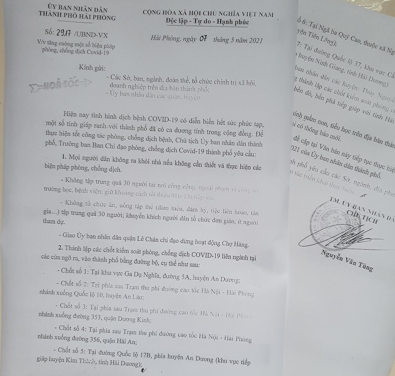 Ba là, Giao Ủy ban nhân dân các huyện: Thủy Nguyên, An Dương, An Lão, Vĩnh Bảo, Tiên Lãng thành lập các chốt kiểm soát phòng chống dịch bệnh tại các đường mòn, lối mở, bến đò, bến phà tiếp giáp với tỉnh Hải Dương và tỉnh Thái Bình.
