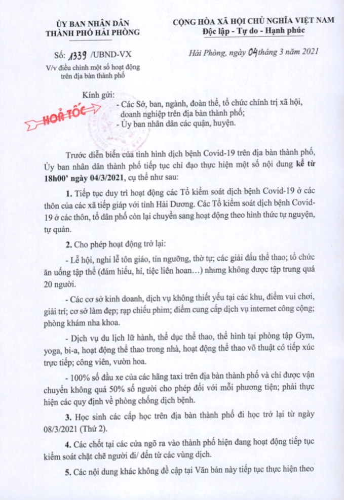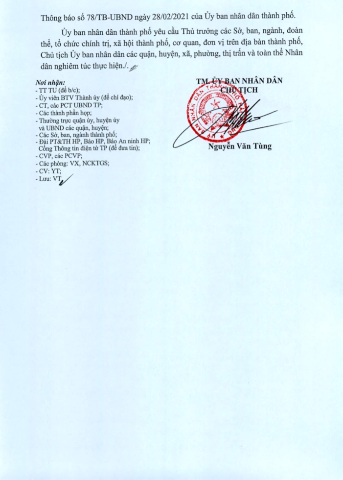 Học sinh các cấp học trên địa bàn thành phố đi học trở lại từ ngày 8/3/202; Các chốt tại các cửa ngõ ra vào thành phố hiện đang hoạt động tiếp tục kiểm soát chặt chẽ người đi, đến từ các vùng dịch; Các nội dung khác không đề cập tại Văn bản này tiếp tục thực hiện theo Thông báo số 78/TB-UBND ngày 28/02/2021 của UBND thành phố.