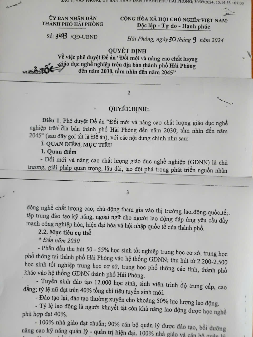 Mục tiêu của Đề án đến năm 2030 phấn đấu thu hút 50 - 55% học sinh tốt nghiệp THCS, THPT tại Hải Phòng vào hệ thống giáo dục nghề nghiệp’ thu hút từ 2.200 - 2.500 học sinh tốt nghiệp THCS, THPT các tỉnh, thành phố khác vào hệ thống giáo dục nghề nghiệp Hải Phòng; Tuyển sinh, đào tạo 12.000 học sinh, sinh viên trình độ trung cấp, cao đẳngl tỷ lệ nữ đạt trên 40% tổng chỉ tiêu tổng tuyển sinh mới; Đào tạo lại, đào tạo thường xuyên cho khoảng 50% lực lượng lao động; tỷ lệ lao động là người khuyết tật còn khả năng lao động được học nghề phù hợp đạt 40%; 100% nhà giáo đạt chuẩn; 90% cán bộ quản lý được đào tạo, bồi dưỡng, nâng cao kỹ năng quản lý - quản trị hiện địa; Ít nhất có 70% có sở giáo dục nghề nghiệp và 100% chương trình đào tạo các ngành, nghề trọng điểm đạt tiêu chuẩn kiểm định chất lượng; Phấn đấu chuẩn đầu ra chương trình đào tạo của các trình độ được tích hợp năng lượng số, có nội dung đào tạo phù hợp với phương thức chuyển đổi số; …