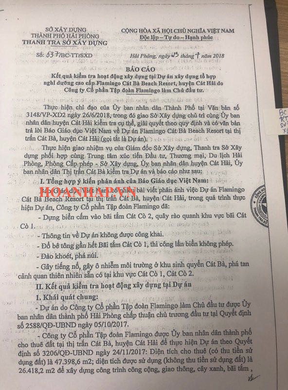 HOANHAP.VN - Ngay sau khi có những phản ánh từ báo chí về một loạt nghi vấn liên quan đến sai phạm của chủ đầu tư dự án Flamingo Cát Bà Beach Resort, Thanh tra Sở Xây dựng Thành phố Hải Phòng đã tổ chức đoàn thanh kiểm tra toàn bộ dự án. Ngày 23/7/2018, Thanh tra Sở Xây dựng thành phố Hải Phòng đã có báo cáo kết luận thanh tra số 637/BC-TTSXD về kết quả kiểm tra hoạt động xây dựng tại dự án Flamingo Cát Bà Beach Resort.