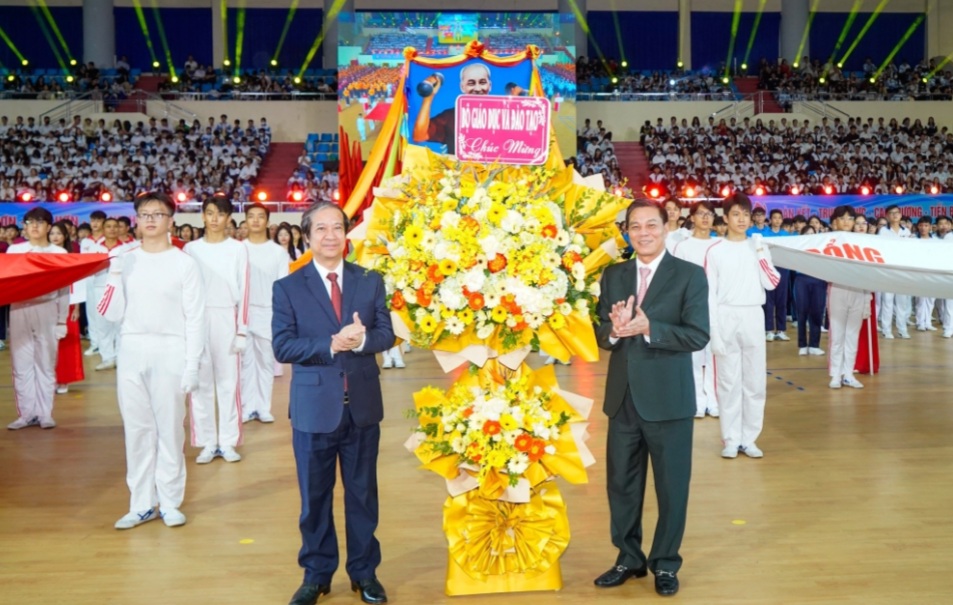 Bộ trưởng Bộ GD&ĐT Nguyễn Kim Sơn tặng hoa Hội khỏe Phù Đổng