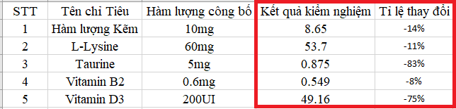 Kết quả kiểm nghiệm cho thấy 6/9 thành phần cho kết quả giảm so với hàm lượng mà Công ty CP Nam Dược công bố.
