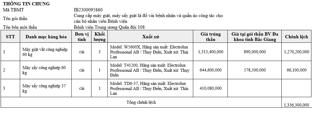 Với loại hàng hóa là Máy sấy công nghiệp 60 kg trong gói thầu của Bệnh viện Trung ương Quân đội 108 có “Model: T41200, Hãng sản xuất: Electrolux Professional AB / Thụy Điển, Xuất xứ: Thụy Điển” giá trúng thầu là 644.600.000 VND, tuy nhiên Model này trong gói thầu do Bệnh viện Đa khoa tỉnh Bắc Giang chỉ có giá 578.500.000 VND, chênh 66.100.000 VND.
