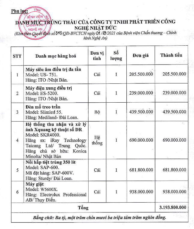 Cùng sản phẩm máy giặt W5600X, giá ở gói thầu tại Bệnh viện Chấn thương - Chỉnh hình Nghệ An chỉ có 938 triệu trong khi ở bệnh viện 108 lên tới hơn 1,3 tỷ đồng.
