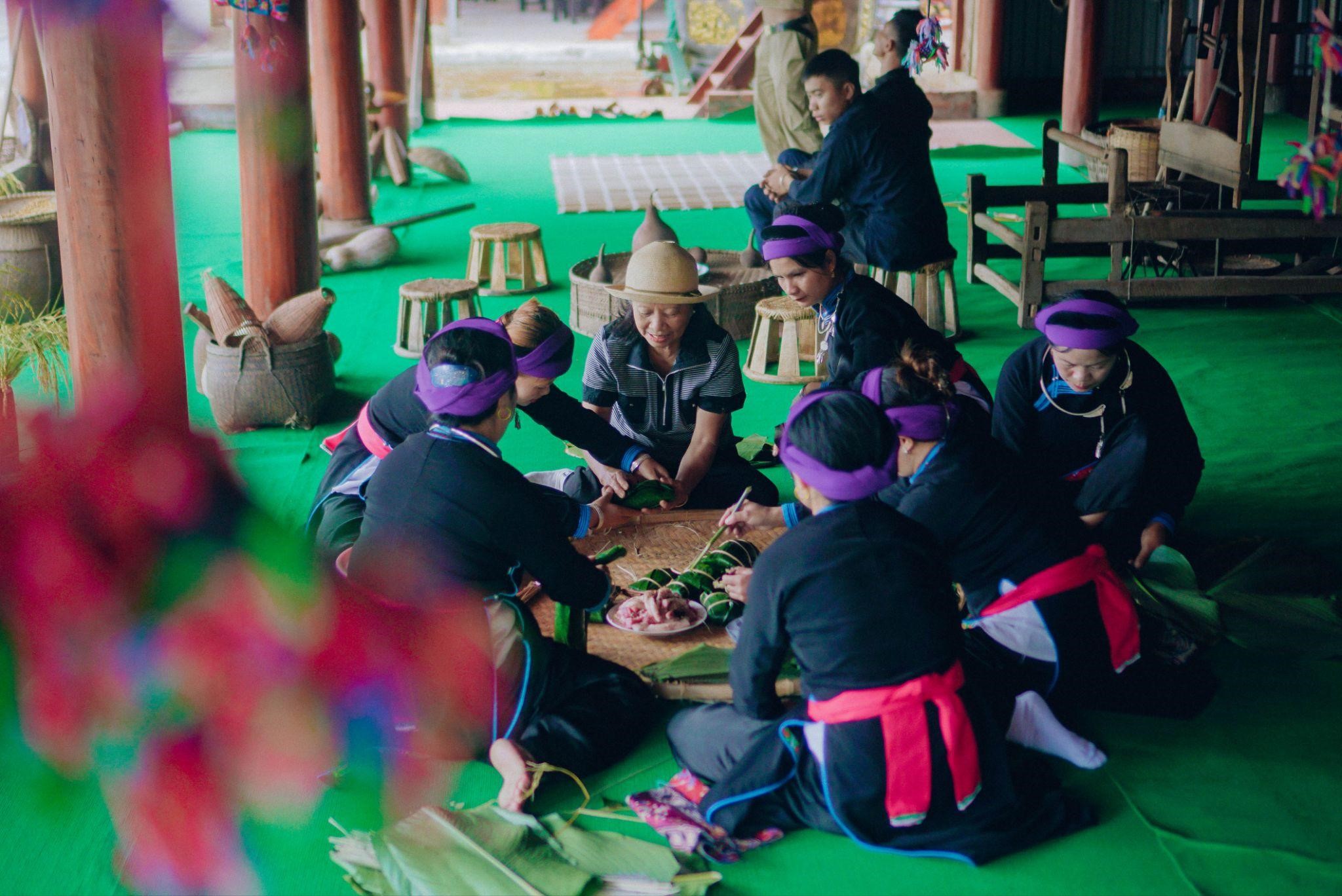 Du khách trải nghiệm gói bánh chưng ở chợ quê Sun World Fansipan Legend.