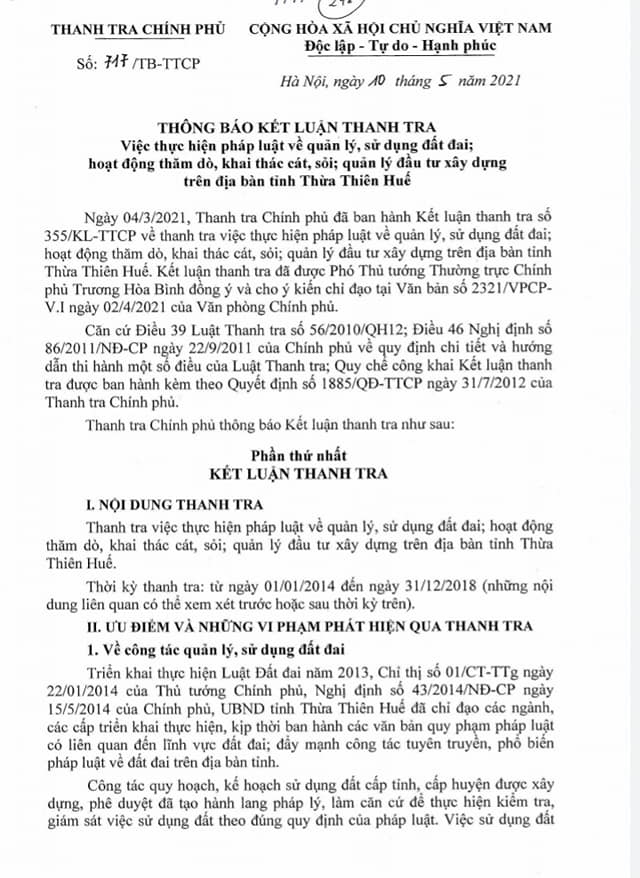 Nội dung kết luận của Thanh tra Chính phủ cụ thể: Việc mua bán tài sản gắn liền với đất, giao đất, cho thuê đất... cho một số trường hợp chưa đúng với quy định. Việc cho phép hoán đổi 07 hộ có đất ở từ khu Lò Gạch (cũ) sang khu quy hoạch Tổ 9, phường Phú Bài, thị xã Hương Thủy chưa phù hợp, xác định giá chưa đúng, làm thất thu ngân sách 1.108,302 triệu đồng; Việc phân lô tổ chức bán đấu giá 18 lô đất tại xã Thủy Bằng, thị xã Hương Thủy chưa minh bạch, có dấu hiệu dàn xếp; UBND thành phố Huế bán chỉ định lô đất A7, thành phố Huế có diện tích 195,2 m2 thuộc quỹ đất trong kế hoạch đấu giá cho ông Huỳnh Cư, Bí thư Thành ủy thành phố Huế là thể hiện sự tuỳ tiện, làm thất thu ngân sách nhà nước.