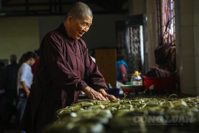 Ni sư chủ trì chùa Thích Tịnh Quán cho hay: "Đến ngày hôm nay đã gói được hơn 7.000 chiếc bánh chưng, chùa sẽ gói liên tục để gửi vào ủng hộ lũ miền trung hỗ trợ bão lũ". Ảnh PV Nhà báo và Công Luận.