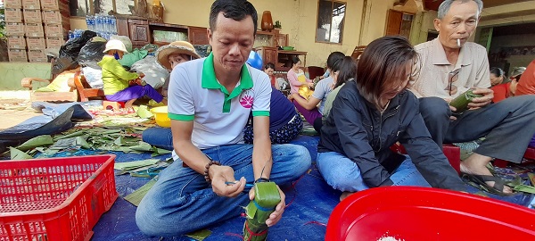 Anh Nguyễn Hữu Phú, Nhóm trưởng nhóm thiện nguyện Hoa Sen 47 Đắk Lắk cùng hàng trăm người dân gói bánh tét cứu trợ người dân miền Trung.