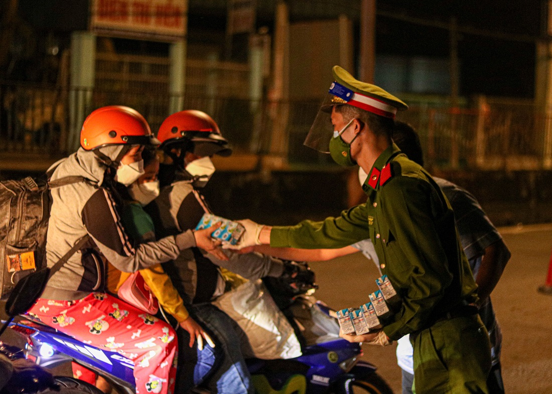 Trên đường di chuyển qua chốt, những xe máy có em nhỏ được các chiến sĩ công an gửi tặng thêm sữa.