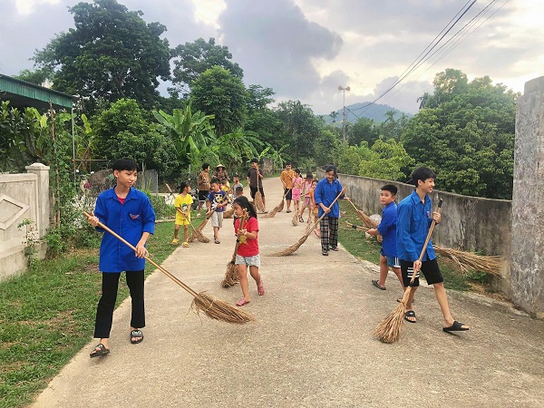 Các đoàn viên, đội viên và các cháu thiếu nhi tham gia giữ dìn vệ sinh đường làng, ngõ xóm