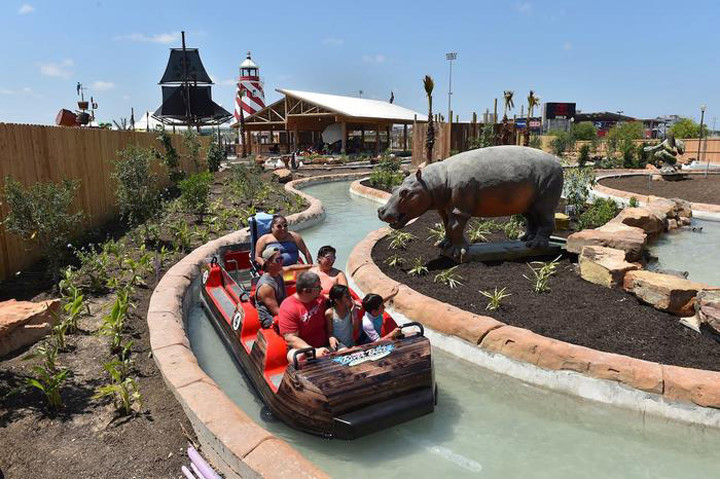 Cả gia đình trải nghiệm chuyến du ngoạn trên sông lười chảy vòng quanh công viên nước.