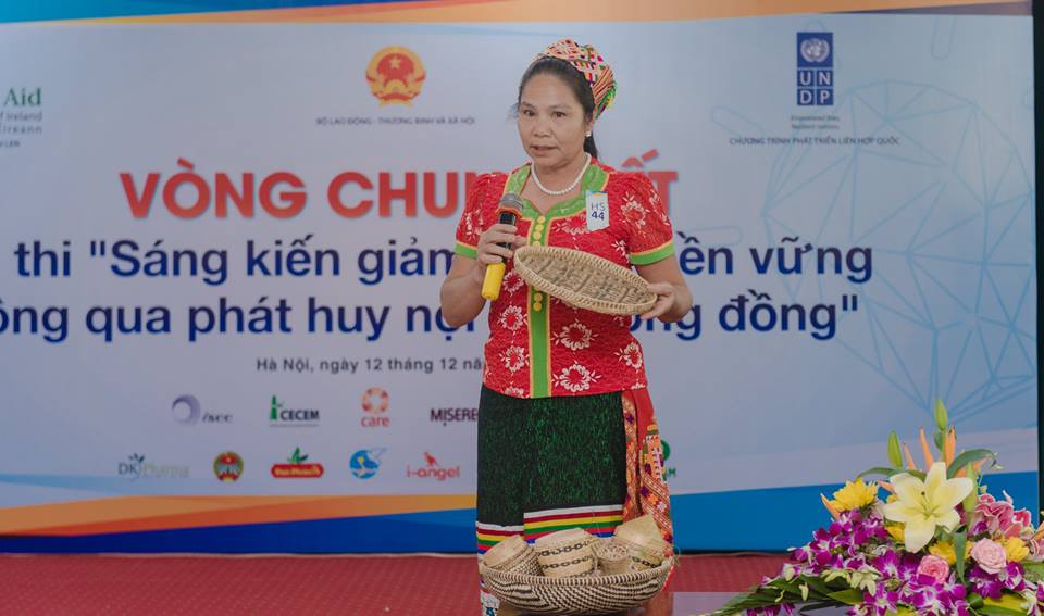 | Chị Hoa giới thiệu sản phẩm đan của nhóm tại cuộc thi Sáng kiến giảm nghèo bền vững thông qua phát huy nội lực cộng đồng. |