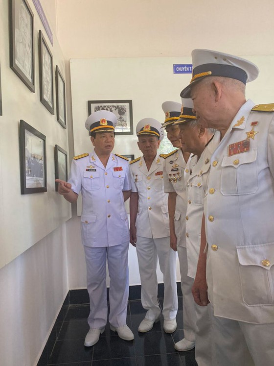 | Ông Đào Hồng Tuyển cùng các tướng lĩnh Đoàn tàu không số ôn lại kỷ niệm chuyến tàu đầu tiên rời Bến Tre ra Bắc nhận vũ khí. |