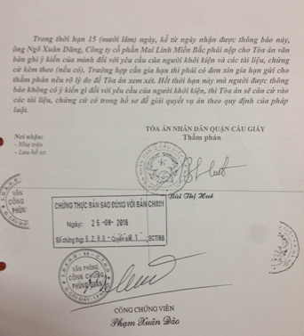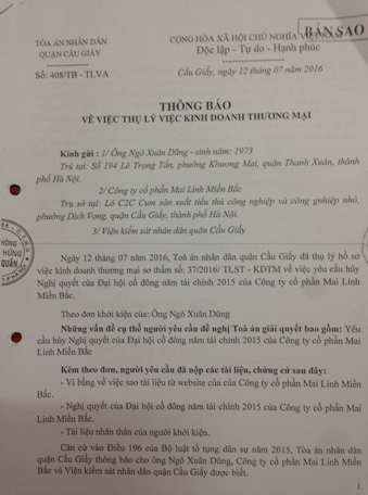 Do đó, ông Ngô Xuân Dũng đã có đơn gửi đến Tòa án nhân dân quận Cầu Giấy, yêu cầu hủy bỏ Nghị quyết ngày 06/6/2016 của Đại hội đồng cổ đông thường niên năm tài chính năm 2015 của MLMB. Về vấn đề này, ngày 12/7/2016, Tòa án nhân dân quận Cầu Giấy đã thụ lý hồ sơ việc kinh doanh thương mại sơ thẩm số 37/2016/TLST-KDTM.