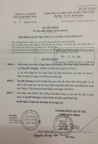 Quyết định miễn nhiễm chức danh Tổng Giám đốc MLMB đối với Hồ Chương do ông Hồ Huy ký.