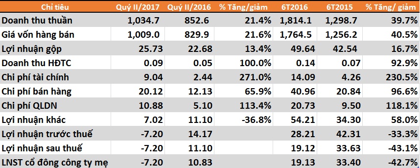 Chi phí tài chính tăng mạnh từ 2,44 tỷ đồng lên hơn 9 tỷ đồng, tức tăng gấp 3,7 lần do phát sinh chi phí lãi vay, trong khi doanh thu hoạt động tài chính không đáng kể. Hai khoản chi phí bán hàng và chi phí quản lý doanh nghiệp tăng lần lượt 66% và 113,4% so với cùng kỳ năm trước.