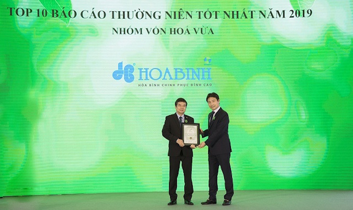 Ngoài ra, báo cáo thường niên với chủ đề “Cánh diều ngược gió” của Tập đoàn Xây dựng Hòa Bình (HBC) cũng được trao giải Top 10 Báo cáo thường niên tốt nhất nhóm doanh nghiệp niêm yết vốn hóa vừa tại Lễ trao giải Cuộc bình chọn doanh nghiệp niêm yết 2019 do Sở Giao dịch chứng khoán TP.HCM (HOSE), Sở Giao dịch chứng khoán Hà Nội (HNX) và Báo Đầu tư tổ chức vào tối ngày 28/11/2019.