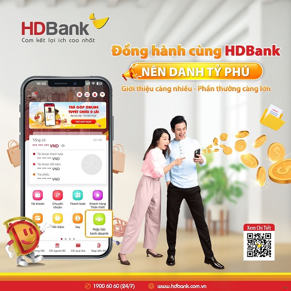 Cụ thể, chương trình hợp tác kinh doanh“Đồng hành cùng HDBank, nên danh tỷ phú” năm 2024 - cơ hội tăng thu nhập linh động cho tất cả mọi người đã khởi động trên toàn quốc. Sau 4 năm triển khai, chương trình đã mang đến nguồn thu nhập chủ động và thụ động vô cùng hấp dẫn cho hàng ngàn cộng tác viên. Toàn bộ quá trình bán hàng đều được thực hiện dễ dàng, mọi lúc mọi nơi trên App HDBank, không bó buộc thời gian và không gian.
