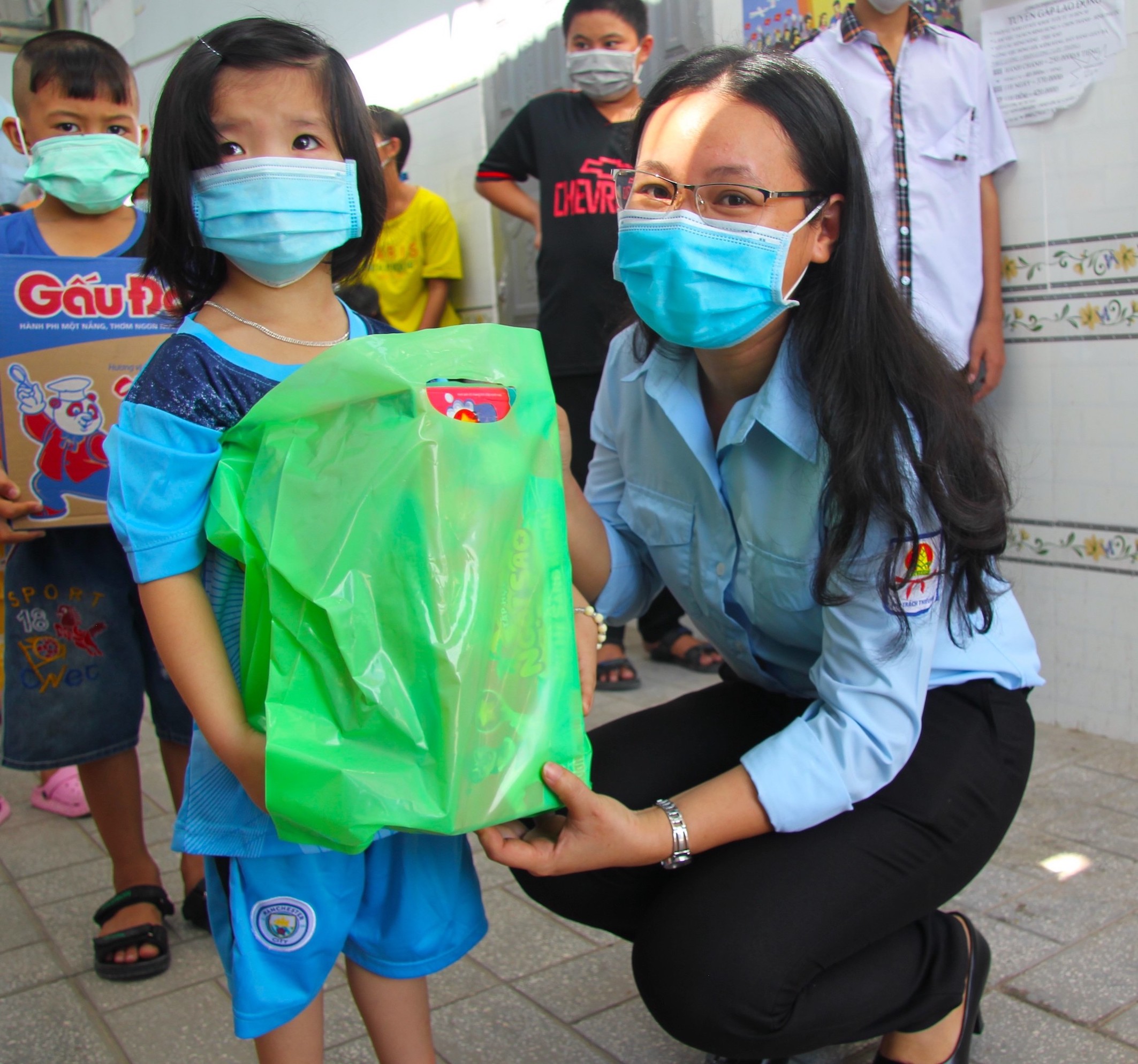 Chị Lê Thị Hồng Phấn, Phó Bí thư Tỉnh Đoàn, Chủ tịch Hội đồng Đội tỉnh trao quà cho con em thanh niên công nhân có hoàn cảnh khó khăn ở khu nhà trọ tại xã Minh Hưng (H. Chơn Thành).