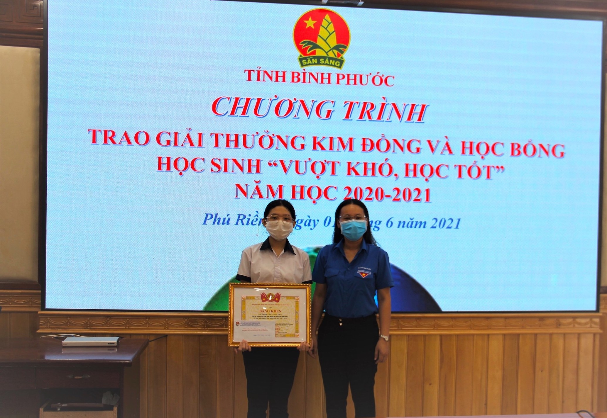 Chị Lê Thị Hồng Phấn, Phó Bí thư Tỉnh Đoàn, Chủ tịch Hội đồng Đội tỉnh (bìa phải) trao giải thưởng Kim Đồng cho em Phạm Thị Xuân Mai, học sinh lớp 9a5, trường THCS Long Hưng, huyện Phú Riềng.
