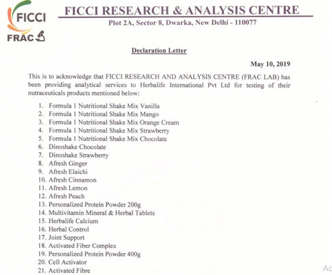 Đối với 3 sản phẩm giảm cân Formula 1 Shake Mix, Personalized Protein Powder và Afresh Energy Drink, được cho là nguyên nhân gây ra cái chết của nữ bệnh nhân 24 tuổi ở Ấn Độ, Herbalife cho biết đã yêu cầu một phòng thí nghiệm độc lập ở nước này chứng nhận kiểm nghiệm 3 sản phẩm trên. Kết quả kiểm nghiệm ngày 10/5 xác nhận cả 3 sản phẩm này an toàn và tuân thủ tất cả quy định về an toàn thực phẩm của Ấn Độ.